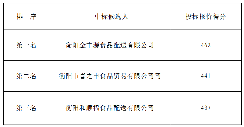 衡陽市衡府賓館有限公司(養(yǎng)正園)食堂食材(肉類)于2021年1月27日上午9時(shí)00分(北京時(shí)間)進(jìn)行了比選開標(biāo)、評(píng)標(biāo)活動(dòng),評(píng)標(biāo)小組按照招標(biāo)公告規(guī)定的評(píng)標(biāo)辦法及原則進(jìn)行評(píng)定,確定中標(biāo)候選人如下: