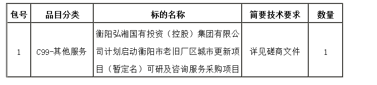 采購(gòu)項(xiàng)目名稱(chēng):衡陽(yáng)弘湘國(guó)有投資(控股)集團(tuán)有限公司計(jì)劃啟動(dòng)衡陽(yáng)市老舊廠區(qū)城市更新項(xiàng)目(暫定名)可研及咨詢(xún)服務(wù)采購(gòu)項(xiàng)目