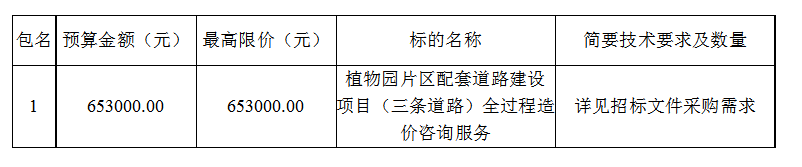 內(nèi)容:負責完成植物園片區(qū)配套道路建設(shè)項目(三條道路)全過程造價咨詢服務(wù)工作,具體服務(wù)內(nèi)容見招標文件采購需求。