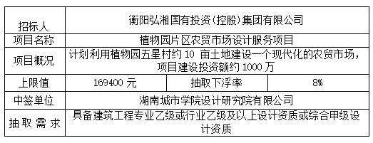 植物園片區(qū)農(nóng)貿(mào)市場設(shè)計服務(wù)項目于2025年8月1日在衡陽國投4棟3樓評標室進行了隨機抽取,現(xiàn)將相關(guān)信息予以公示。