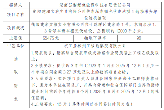 衡陽建湘文旅實(shí)業(yè)有限公司停車場車棚光伏電站項(xiàng)目勘察服務(wù)隨機(jī)抽取結(jié)果公示